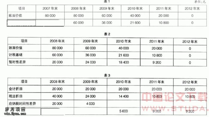 例1,A企业2007年12月购入价值100 000元的设备,预计使用期5年,无残值。会计上采用直线法计提折旧,税法允许采用双倍余额递减法计提折旧。