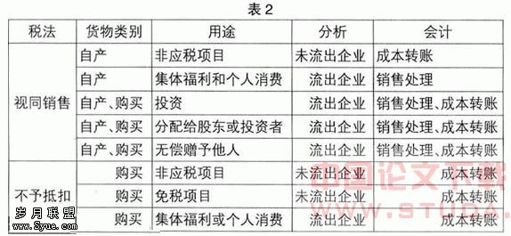 从以上不同情形的账务处理(部分)中可以看出:自产产品用于本企业非应税项目,即没有流转出本企业,在上按成本转账;自产产品用于本企业以外其它交易如投资转出等,即流转出本企业,在会计上做销售处理。购买的产品用于投资、集体福利或个人消费等,无论是否流出本企业,在会计上均按成本转账。如表2所示。●