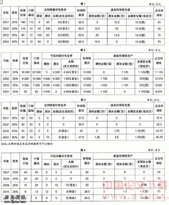 例如:某企业2000年12月29日,将自行建造的一生产车间投入使用,其建造成本为30 050万元,预计的净残值为50万元,(会计与税法相同)。会计与税法均按4年计提折旧,会计上采用年数总和法计提折旧,而税法规定采用直线法计提折旧,企业2001年至2004年,每年实现的利润总额均为40 000万元,所得税率为25%,采用资产负债表债务法核算所得税。要求:根据上述资料完成下列表格。(表2)