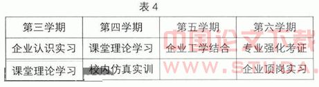 学生在学习专业课之前,首先进入认识实习(第三学期),在课堂学完会计特定岗位的理论知识后,进入校内实训室进行相关项目仿真实训(第四学期),之后安排学生到企业进行工学结合实习(第五学期),第六学期专业强化考证取得上岗证书,然后安排学生再次在企业工学结合或顶岗实习(如表所示)。