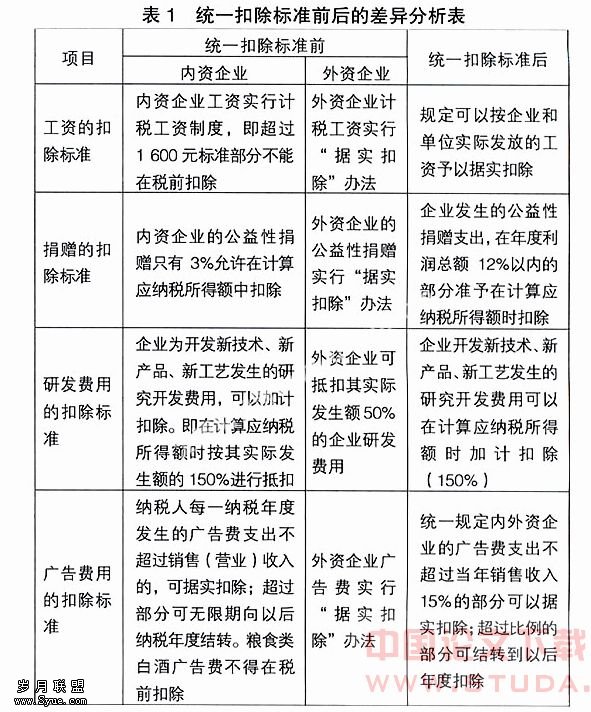 统一税率意味着内、外资企业的税收差异将被弥合,外资企业因其投资来源的特殊性所享有的税收优惠政策将被取消。企业所得税的税率统一为25%,名义上税率由33%降低了8个百分点,但就实际税收负担率而言,在两税合并之前,由于外资企业享有各种形式的地方所得税的减免和税收优惠政策,其实际的税收负担率大约为14.98%。因此。新税法颁布实施之后,外资企业的实际税率有所提高。 二、扣除标准