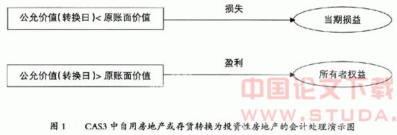 CAS3规定,无论是将自用房地产还是将存货转换为公允价值模式计量的投资性房地产,转换当日的公允价值小于原账面价值的,其差额计入当期损益;转换当日的公允价值大于原账面价值的,其差额计入所有者权益。 见图1。