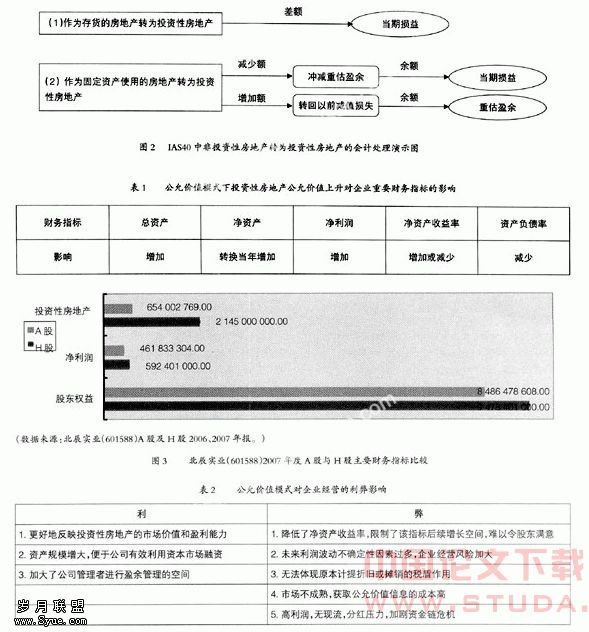 5. 对盈余管理的影响。CAS3规定,企业可以在成本模式和公允价值模式两者之间做出选择,这为企业进行盈余管理带来了更大的空间。以ST华侨(600759)为例,其2007年年报显示,投资性房地产采用公允价值模式进行后续计量,其2007年度新增13.181亿元投资性房地产,当年公允价值上升580万元,年末投资性房地产公允价值为13.239亿元。与投资性房地产公允价值增值给ST华侨带来的收益580万元相比,由于其无需计提折旧而增加的利润5 270万元(按取得成本13.181亿元和折旧年限25年估计)更加可观。
