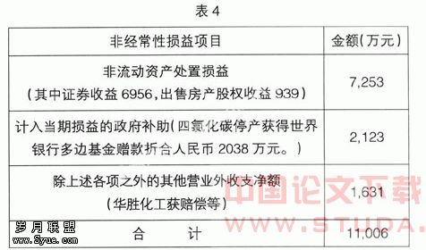 令人高兴地看到,该公司2007年顶住二大主导产品延续高速增长的压力,国际油价持续上涨,导致公司主要原料价格攀升的压力,国家宏观政策调控,抑制高能耗资源型产品出口,取消和降低产品出口退税的压力,受滨海化工区全资子公司上下游企业非正常生产影响的压力,实现主营收入50.97亿元,比2006年增长35.02%,净利润从2006年亏损19,297万元到盈利5,579万元。但是,由于滨海化工区全资子公司上下游企业非正常生产对利润的负面影响达9,728万元。因此,剔除非经常性损益因素,公司主营业务亏损5,426万元。2007年度非经常性损益对公司净利润贡献11,006万元。具体见表4: