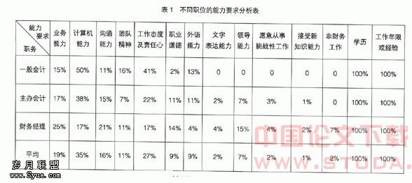 美国对会计人员的能力要求有27项,我国实务部门对会计人员的能力要求也发生了很大的变化,我国实务部门对会计人员的计算机能力、工作态度及责任心有较高的要求;对会计人员的沟通能力、团队精神也日益受到重视,而且职位越高对沟通能力的要求越高;对职业道德、外语能力、领导能力、文字表达能力、接受新知识能力等也引起了实务界的关注。会计教育要以培养这些能力为主要目标,满足实务部门对会计人才的需求。