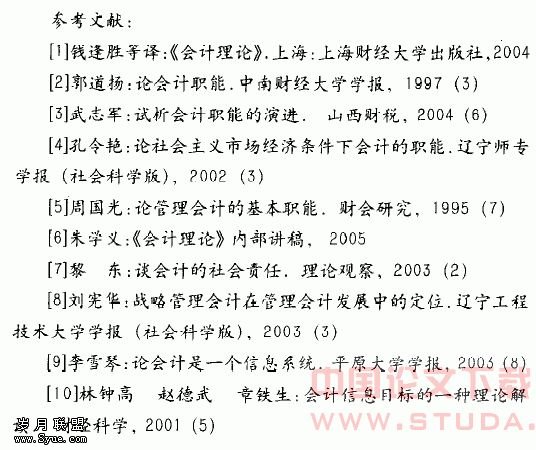 1953年美国会计学家利特尔顿(A·C·Littleton)指出:“会计是一种特殊门类的信息服务”,他还认为“会计的显著目的在于对一个经济活动提供某种有意义的信息”。1966年在美国会计学会所发布的《会计基本理论说明书》中对会计作出了如下的定义:“从本质上讲,会计是一个信息系统。……会计既是一个经营实体一般信息系统的一部分,又是信息概念范畴中的一部分”。同时,1970年美国注册会计师协会(AICPA)所属的会计原则委员会在第四号公报中也指出:“会计是一种服务活动,它的功能是提供有关经济事项的定量信息,该类信息主要是财务性的,而且对经济决策用”。所有这些都强调了会计的信息服务职能,这种观点从上个世纪产生发展以来已经在世界会计界占有了一席重要的地位。