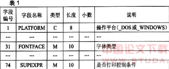 我们知道在VFP中,报表的信息是保存在以.FRX为扩展名的数据库文件中(备注文件以.FRT为扩展名),了解报表数据库的结构有助于问题的解决。报表库(.FRX)的结构有74个字段,各字段的主要参数摘录如表所示。