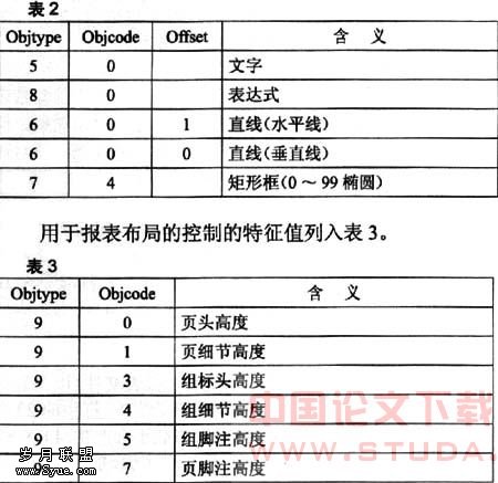 报表数据库的字段Objtype(对象类型)和Objcode(对象代码)的值确定了控制对象的类型。为节省篇幅仅把最常用制表控制对象(文字,直线,表达式等)的特征值如表2所示。