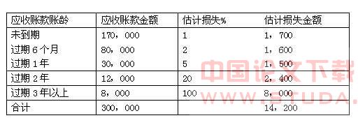 例:某企业本期应收账款期末余额为300000元,估计坏账损失占应收账款的比例为5%,本年度的赊销净额是900000元。根据经验并参照当前有关资料,估计坏账损失约占赊销净额的2%。本期末应收账款账龄分析及估计坏账损失表如下: