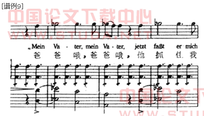 在舒伯特的《魔王》中,当孩子三次惊呼:“爸爸哦,爸爸哦”时,伴奏声部与旋律声部之间形成的三个不协和音碰在一起,产生出的和声效果成功地渲染了作品的恐怖气氛。伴奏时需加强音量并与歌声融为一体,以突出人物的内心世界。
