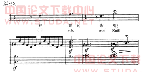在第二段句末,当歌声唱到“和他的亲吻”时,钢琴伴奏突然从连续的流动六连音音型变为接连三小节的柱式和弦音型,描绘出歌中少女沉溺于幸福的想象时,纺车停下,棉线中断的情景。这样的处理,使全曲具有更鲜明的形象性。