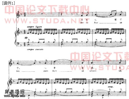 深化和延展诗意在舒曼的作品中表现得淋漓尽致。他使声乐与钢琴完全融合而不可分割,运用丰富的钢琴伴奏织体,提示出歌词的心理内容。如作品《诗人之恋》其中第八曲《那小巧的花儿们如果知道》,歌曲的色调一直比较明朗,只是到最后才出现心理上的冲突。钢琴部分运用摇荡的震音式手法,描绘出主人公寄悲情于大自然的压抑心理;而在后奏中则以狂热的音响奔腾,节奏的尖锐紧张,戏剧性地表现了歌词中余意未尽的隐痛。