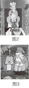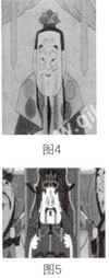 动画片《天书奇谈》中府尹大人的造型也完全采用了无锡纸马的造型。(见图5)需要注意的是,片中的府尹大人造型与无锡纸马本身的民俗蕴涵相差甚远。因为府尹大人在其中不仅不作为神灵出现,而且还被塑造成一个贪婪好色的恶俗、昏庸之辈。创作者显然将其作为一个被讽刺的人物加以塑造,完全忽略了纸马神像的民俗内涵。结合前面提到的《大闹天宫》中玉皇大帝的形象(这也与我们顶礼膜拜的具有正义品格的神仙形象相背离),可以认为:无锡纸马与生俱来的深刻而极具夸张意味的造型,如果将其加以变化,又可以十分巧妙地塑造并讽刺那些高高在上、无恶不作的封建官僚。