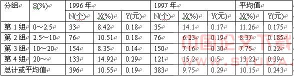 王斌(2000)依据中国股份制信息评价中心1996和1997年3184家非上市企业的统计资料,抽取1996年396家和1997年383家企业进行职工持股试点的企业作了一定分析,研究表明,职工持股促使企业的经营绩效有所提高。他按内部职工持股占企业总股本的比例把企业分成4组,即第1组0<S≤2.5%,第2组2.5%<S≤10%,第3组10%<S≤20%和第4组20%以上。企业职工持股比例在20%以上的企业,其平均净资产收益率及每股收益都明显高于前3组(表1)。该研究不足之处是,并没有发现企业绩效与内部职工持股比例存在正相关关系。虽然我们根据表1中最后一栏的平均每股收益(Y),可以大致的出一种正相关关系,但平均净资产收益率(X)并不存在这种关系。