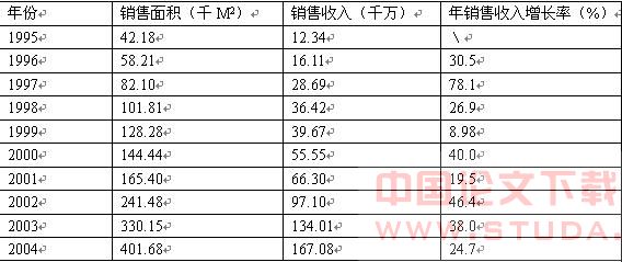 金地集团成立于1988年,1989年正式开始经营运作,其发展历经深圳市房地产业发展的后三阶段。因为金地集团从1995年正式开始实行员工持股制度,因此,我们重点比较1995-2004年间,深圳市房地产行业和金地集团销售收入的变化。金地集团1995-2004年房地产业的销售面积和销售收入情况如下表5所示: