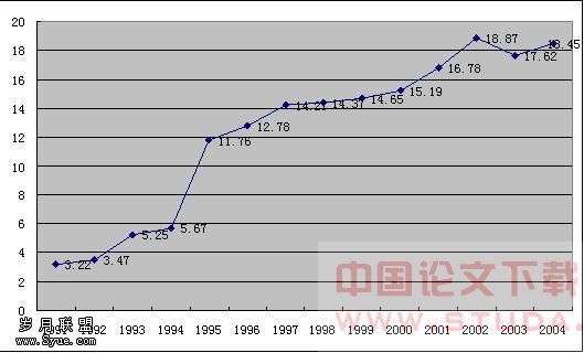 金地集团在1991-1994年期间,企业的经营效率相对来说比较低。1995年-2004年这段时间内,随着员工持股制度的实行,制度变迁对企业经营效率的影响十分积极,是经营管理绩效提高的主要源泉,企业的销售收入持续、快速提高,总资产报酬率维持在较高水平,可以从以下两个图比较直观地看出。