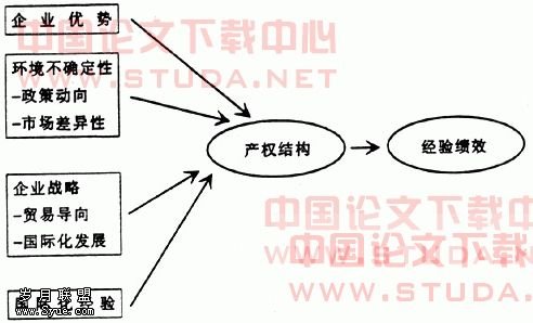 这里,我们用一个概念性的因果关系模型来讨论本文提出的问题。在此模型中,企业 优势、环境不确定性、企业战略和国际化经验等作为影响产权结构选择的独立变量,而 产权结构对企业的经营绩效将产生影响。