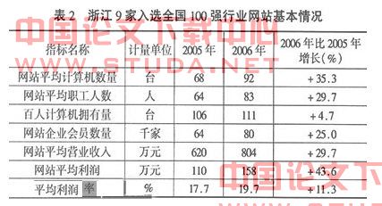相对大多数综合性网站出现经营性亏损来说,行业网站发展快效益好。通过对浙江9家全国百强行业网站的调查分析,网站平均企业会员数量6.4万家,网站平均利润达158万元,并且都以较高增速发展,这除了得益于浙江理想的行业网站发展外部环境外,企业内部信息化基础相当好。调查显示,2005年浙江9家全国百强行业网站百人机拥有量为106台,2006年达到111台,电脑硬件设施已满足每人1台,许多人既有台式机又配了笔记本电脑(见表2)。调查还显示,浙江9家全国百强行业网站74%的企业基本建设完成OA系统,49%的企业基本建设完成CRM系统,表明企业不仅重视信息化建设,还已向管理深化阶段发展,也体现出行业网站企业期望借助信息化手段提升客户关系以及内部资源的管理能力和质量。