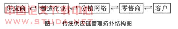 1.传统供应链管理结构分析。传统的供应链管理仅仅是一个横向的集成,通过通讯介质将预先指定的供应商、制造商、分销商、零售商和客户依次联系起来。这种供应链侧重于内部联系,灵活性差,仅限于点到点的集成。因此,供应链管理成本高、效率低,而且供应链的一个环节断了,将会造成整个供应链运行瘫痪。
