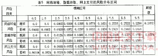 运用CIM的并联响应模型,分别对各风险因素进行并联叠加,求出环境风险、数据存取风险、网上支付风险概率分布区间、影响分布区间,见表5。