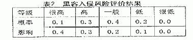 以网络环境风险中的黑客入侵为例,说明风险因素的模糊评价定量化过程。经专家评定,黑客入侵风险评价结果如表2。