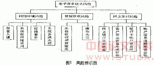 电子商务的技术风险是指涉及终端设备及其传输介质的各种风险,分为三类:网络环境风险、数据存取风险、网上支付风险,风险辨识图如图1所示。
