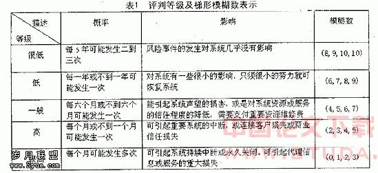 构造电子商务的网络环境、数据存取、网上支付的风险因素集和评判集,风险发生概率评判集、风险产生影响评判集以及所对应的梯形模糊数见表1。