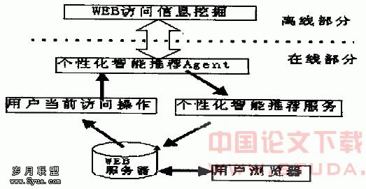 Web访问信息挖掘是离线处理的,而当用户访问该网站时通过在线推荐引擎进行在线服务。挖掘算法和推荐策略可以根据不同类型站点的要求来具体选择,挖掘结果和推荐集通过推荐引擎反馈给用户。电子商务网站的会员用户通过会员标识登录网站以后,其访问信息将会被记录到服务器端。这些数据将在经过预处理后,在专用的数据挖掘模块中,通过具体的挖掘算法和推荐策略来进行模式识别和模式分析。用户访问信息也会传到推荐引擎,推荐引擎根据用户的会员标识,向挖掘模块抽取对应用户的挖掘结果和推荐集,将其可视化地反馈给用户,达到个性化服务的目的。