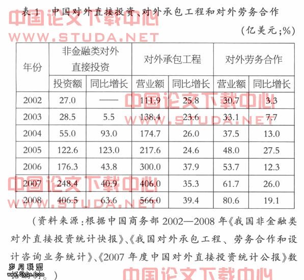 (1)提升中国在全球经济中的地位。截至2008年底,我国对外直接投资额突破500亿美元,达到521.5亿美元,其中非金融类直接投资406.5亿美元,占78%;金融类115亿美元,占22%,境外中资企业超过一万家;我国对外承包工程累计完成营业额2630亿美元,签订合同额4341亿美元;我国对外劳务合作累计完成营业额559亿美元、合同额599亿美元、累计派出各类劳务人员462万人;我国对外设计咨询累计完成营业额26.7亿美元,签订合同额46.6亿美元。通过具有宏观影响力和国家长远发展战略意义的对外投资,提高国家在全球经济中的地位,在国际资源分配中争取一个更加有利的形势并改善与相关国家和地区的关系。