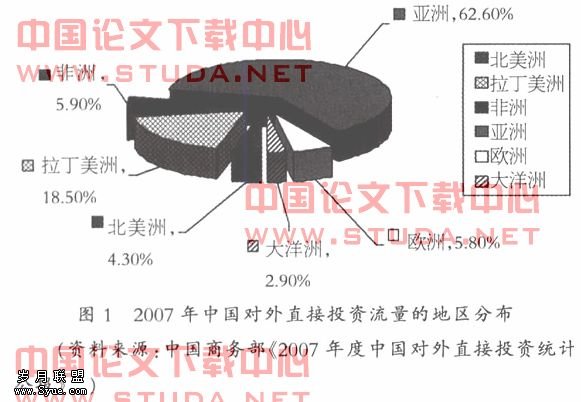 最后,我国的对外投资主要集中在亚洲尤其是香港地区。2007年我国对外直接投资总量的62.6%分布在亚洲各国和地区,其中绝大部分在香港地区;拉丁美洲占18.5%;北美洲占4.3%,主要流向加拿大和美国;欧洲占5.8%,主要流向俄罗斯联邦、德国、英国等国(见图1)。投资过于集中增加了经营风险,不符合投资市场多元化的要求。就我国对外投资而言,应逐步形成“亚洲和拉美为主,非洲,拓展欧美”的多元化市场格局。
