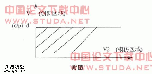 根据图中的这一博弈模型,我们得出如下结论:发达的国家企业进行自主创新研发新的技术所带来的收益相对高于经济不发达的国家企业;同时前者的创新成功率相对较高,也更刺激其积极进行新技术的研发。对于经济相对不发达的国家企业进行新的研发有可能得不偿失。因此当两企业的创新收益分别位于分界线( (c/ p) - d) 的两侧时, 中国企业选择模仿创新是博弈的均衡解。