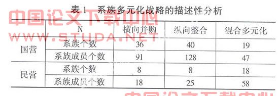 (一)系族多元化战略的实证分析。表1给出了具有不同产权属性的系族其多元化战略的统计分析。可以明显看出,国有产权属性的系族更倾向于选择横向并购和纵向整合的多元化战略,通过,有80%的系族选择了这两种多元化战略,隶属于这些系族的成员企业也占到总国营系族成员总数的82.3%。而对于民营产权属性的系族企业更倾向于选择混合多元化战略,通过计算,53%的民营系族选择了混合多元化战略,隶属于这些系族的成员企业也占到总民营系族成员总数的57.4%。