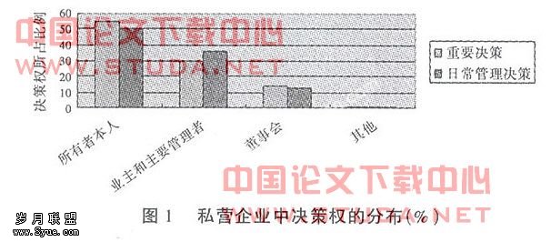 2、所有权与经营权高度统一。家族企业内部是以亲情为纽带的治理结构,所有权与经营权高度统一,业主控制企业的一切,创业家族同时拥有企业的所有者和经营者的双重身份,既是董事长又兼总经理。并且,企业的决策权、执行权、监督权均由家族成员所控制,很少的家族企业设置董事会、股东大会、监事会,即使设置了也只是一些摆设。据有关资料显示,从决策权的分布看:约50%的业主由自己决策,不到15%的交由董事会决策,把经营权交给所聘经理的不到1%。如图1所示: