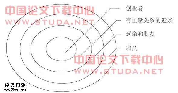 4、企业文化缺失。家族式管理企业文化主要以血缘性、亲缘性、子辈相传为特征。家庭成员相互信任、彼此依赖,对外人构成了一种先天的隔阂,从而导致了家族企业的一种用人怪圈。如下图所示:其中核心圈是领导者由创业者及继承人构成,核心圈以外的事业是由血缘关系的近亲所构成的小圈子,再向外一层的事业是由远亲和朋友所构成的圈子,最外面一层的事业才是由雇员所组成的圈子。它已经成为家族企业用人的潜规则,这种用人制度文化必然使得家族企业把优秀的人才排除在外。