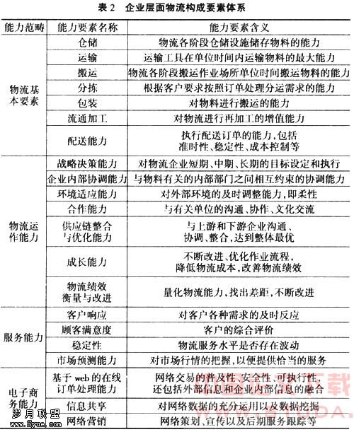 通过上述对传统物流能力的要素和局限性分析,整合我国现阶段物流发展的相关研究成果,根据物流要素的性质,提出物流能力的构成要素包括物流基本要素、物流运作要素、物流服务能力要素和电子商务能力要素,如表2所示。