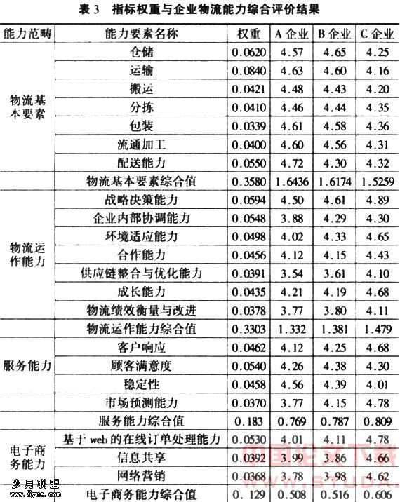 首先,请专家对指标体系中各指标重要性进行两两比较,确定了比较矩阵,由此采用层次分析法计算出各能力的指标权重,然后对A、B、C三个企业的各能力进行5分制评价打分,确定了指标值,并进行各层面的加权平均,如表3所示。