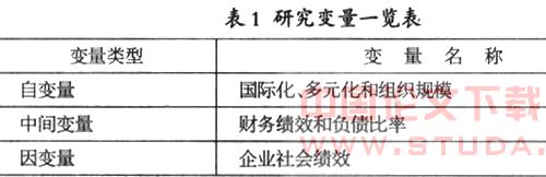 本研究一共有三个自变量:国际化、多元化和组织规模;两个中间变量:财务绩效和负债比率;因变量为企业社会绩效。(见表1)