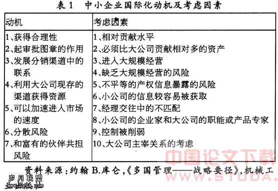 国际化是指根据产品的生命周期,将产品逐步推广到国际市场上的过程。从本质意义上讲,企业国际化的目的是在更大范围内整合资源要素,获取竞争优势,持续地获得企业生存发展的动力。我们可以从表1中简要地了解中小企业国际化的动机和考虑小型跨国公司的国际战略。