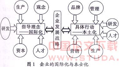 企业以“国际化”为指导理念,以“本土化”为具体行动准则,在开放经济条件下,充分利用国内外资源,从而立足于世界企业之林。(见图1)