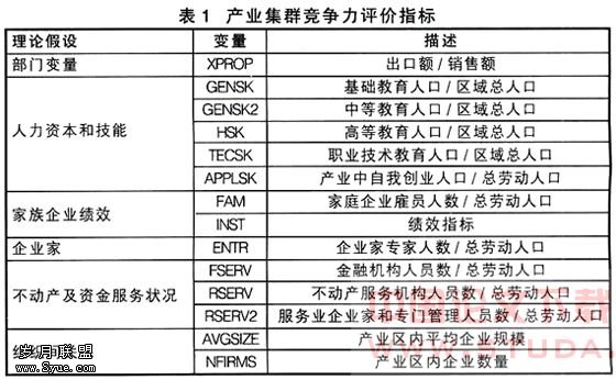 Pietrobelli(1998)则认为以下六个因素影响集群竞争力:人力资本和技术熟练程度;企业经营的家族性程度;相关的制度机构;企业家文化;地方提供不动产和资金的能力;企业之间合作的习惯。具体设定为14个指标(见表1)。