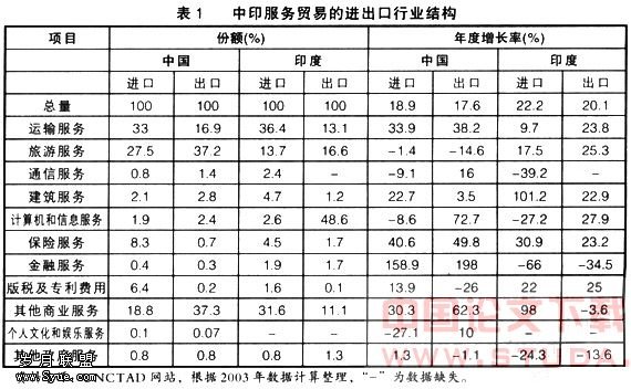 按照联合国贸发会议网站关于世界服务贸易的分类和统计,通过对数据的和整理,2003年中印服务贸易的进出口行业结构如表1。