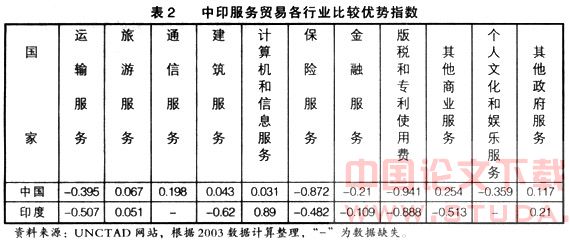 中国的服务贸易竞争力总体上要强于印度,在世界服务贸易中的影响力也大于印度。但是中国只是在“量”上取得了一定的优势,从比较优势指数可以看出,中国从“质”的方面讲优势并不明显。