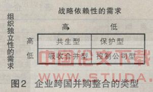 在战略性资产要素层次的整合管理过程中,根据并购双方的战略依赖性和组织独立性程度的高低,可以采取不同的整合方式。这主要有控制公司型、保护型、共生型和吸收合并型四种类型(图2)。其中吸收合并(Absorption)和保护型(Preservation)是比较极端的方式,多数跨国并购整合的结果是既互相依赖又保持一定自治的混合体。在吸收合并(Absorption)情况下,整合意味着跨国并购双方长期形成的营运、组织和文化等全部融合。而保护型(Preservation)跨国并购整合中被跨国并购企业要求有较高的组织独立性,因而跨国并购企业必须以有限干预的方式来控制被跨国并购企业,同时允许后者全面开发和利用其自身的能力,从而使其保持相对较高的独立性。在共生型(Symbiosis)跨国并购整合中,双方企业由最初的独立逐渐转变成相互依赖,因而两家企业之间需要将保护和渗透同时并举。采取控制公司型(Holding Company)整合,一般情况下是由于双方企业战略依赖性和被跨国并购企业组织独立性需求较低所致。