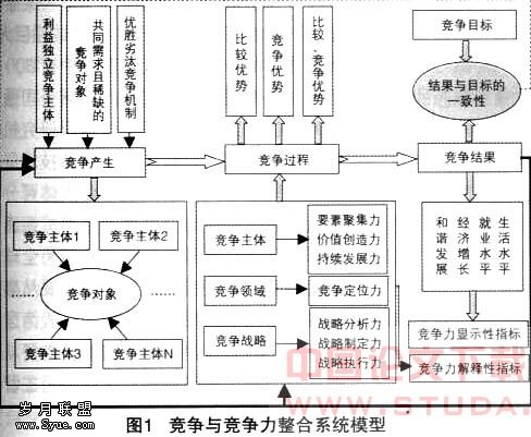 竞争成立的六个要件也都分别整合在图1中了:利益独立的竞争主体、共同需求且稀缺的竞争对象、优胜劣汰的竞争机制决定竞争行为的产生;竞争主体的要素聚集力、价值创造力和可持续发展力决定竞争过程中比较优势和竞争优势的塑造和维持;竞争定位力决定竞争领域,从而决定竞争环境和竞争能力的发挥;竞争战略的分析、制定和执行又会影响各种竞争能力向竞争优势的转化效率;竞争结果与竞争目标的一致性从主客观两个方面影响下一轮竞争行为的产生。这样,竞争与竞争力就实现了系统整合,奠定了整体审视竞争力的理论框架。
