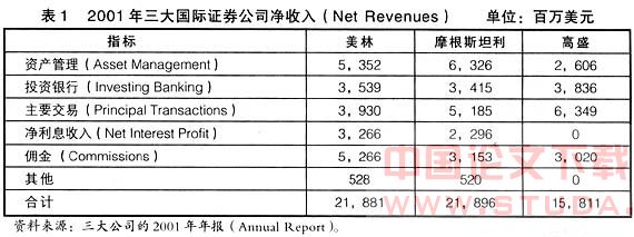 三大国际证券公司的收入主要来自于投资银行、资产管理、主要交易以及净利息收入等主要业务。其主要业务收入见表1。