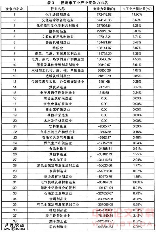 表3按产业竞争力大小对扬州市行业进行了排名。排名越靠前,竞争力越强。从表3可以看出,扬州市工业产业竞争力呈现如下特征: