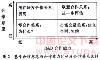 综上所述,在R&D联盟探索阶段消除联盟发展不稳定性的主要缓解机制应集中体现在对潜在合作伙伴合作意图、合作能力、价值创造潜力进行科学合理的评估,并预先采取措施消除误会和冲突并防范合作过程中的机会主义倾向,努力消除企业对研发联盟高期望与现实能力之间的差距。在了解企业合作信誉与合作经验的前提下,对关键的合作意愿与合作能力指标进行评估,在此基础上选择联盟合作伙伴关系建立的类型,如图2。当R&D意愿与能力都较低的情况时,企业之间在R&D方面几乎不存在合作关系,当然有时也出于商业道德、信誉等问题;而在合作意愿高而合作能力低的情况下说明企业R&D资源的专用性程度不高或对外部企业的吸引能力不强,其建立的R&D联盟关系短期内比较稳定,然而研发效率不高,使合作陷入空耗之中;在合作意愿低而合作能力高的情况下,这也是当前普遍存在的情况,社会信用体系不健全、不完善,企业担心核心技术泄漏等,因而不愿与其它企业进行合作研发,当前条件下采取研发外包的方式是重要的选择方式;只有在研发合作意愿与合作能力都比较高的情况下,企业才应建立R&D联盟合作关系,并对R&D战略相容性等后续问题进行评估。