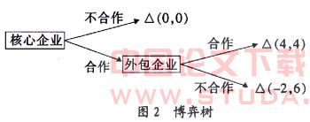 假定两家企业之间是单次博弈,由于核心企业处于主动地位,整个博弈过程应该由核心企业先开始,因此这里假设核心企业先选择,而外包企业在观察到核心企业的行为之后在进行选择,这样的设定符合实际情况。这是完全信息动态博弈,他们之间的博弈树如图2所示。