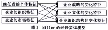 2. Miller et al.(2003)的继任实证模型。Miller et al.(2003)以继任者早年的家庭文化特征、继任者的个性和管理风格、企业的组织结构和文化特征、企业所处的市场特征为自变量,以继任后企业的战略特征、企业文化特征、组织结构特征为因变量,构建实证模型(见图3)。