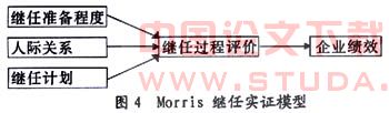 3. Morris et al.(1997)的继任实证模型。Morris(1997)以继任者对继任的准备程度、家族和企业的关系特征、继任计划的实施和控制程度为自变量,以继任过程评价、继任后企业绩效为因变量,构建变量之间的实证模型(见图4)。